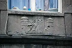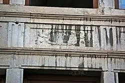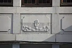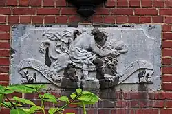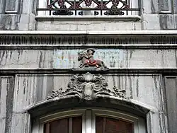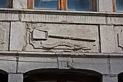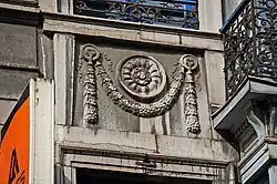 ![]() Façade des étages supérieurs, avec l'oriel ayant pris la place de l'enseigne. ![]() Détail du décor de l'allège gauche du premier étage, dont l'enseigne disparue était une variante. |