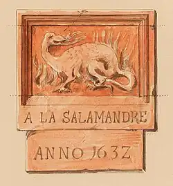 À l'Anneau d'or | Outremeuse | 1723 | Représente un anneau surmonté d'une attache en forme de pomme de pin et entouré de motifs en treillis qu'on retrouve dans l’ébénisterie de l'époque[7]. | |||||||||||