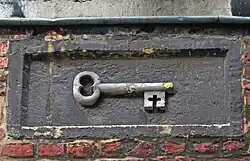 Clef | Centre | Inconnue | Située dans la façade d'un bâtiment du XIXe siècle construit contre les cloîtres de la collégiale Sainte-Croix[6]. | |||||||||||