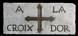 À la croix blanche | Centre | XVIIIe siècle | Le bas de l'enseigne a été martelé dans le cadre de transformations postérieures de la façade, détruisant la base de la croix et la totalité du phylactère. Le nom de l'établissement a cependant pu être inventorié[6]. | |||||||||||