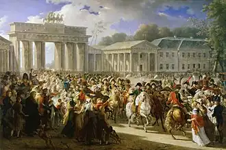 Le tableau historique représente l'entrée de Napoléon à la tête de ses troupes par la porte de Brandebourg après les brillantes victoires près d'Iéna et d'Auerstedt lors de sa campagne de Prusse . Le 27 octobre 1806, le soleil éclaire la capitale. Entouré de ses troupes, Napoléon prend le contrôle de la ville. La Porte de Brandebourg est vue depuis la Pariser Platz . Au premier plan, Napoléon salue de nombreux badauds.