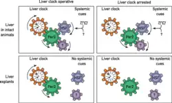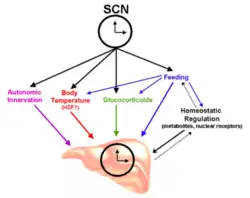 De plus, la nourriture peut induire des changements drastiques de la température corporelle participant aussi à l'entraînement des horloges périphériques[19]. Donc, de façon générale, l’expression rythmique des gènes représente les voies de sortie des oscillateurs périphériques qui, en condition normale, sont synchronisés au NSC. Cependant, lorsqu’un régime alimentaire s’oppose à la phase du NSC sur une longue période, les oscillateurs périphériques deviennent désynchronisés du NSC. Puisque l’imposition d’un régime alimentaire n’affecte pas le NSC, ceci suppose qu’il entraîne indirectement les horloges périphériques par des cycles d’éveil-sommeil et donc d’alimentation[22].