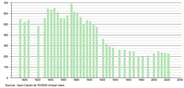 L'évolution du nombre d'habitants est connue à travers les recensements de la population effectués dans la commune depuis 1793. Pour les communes de moins de 10 000 habitants, une enquête de recensement portant sur toute la population est réalisée tous les cinq ans, les populations de référence des années intermédiaires étant quant à elles estimées par interpolation ou extrapolation[19]. Pour la commune, le premier recensement exhaustif entrant dans le cadre du nouveau dispositif a été réalisé en 2006[20].