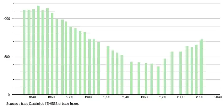 L'évolution du nombre d'habitants est connue à travers les recensements de la population effectués dans la commune depuis 1831. Pour les communes de moins de 10 000 habitants, une enquête de recensement portant sur toute la population est réalisée tous les cinq ans, les populations de référence des années intermédiaires étant quant à elles estimées par interpolation ou extrapolation[25]. Pour la commune, le premier recensement exhaustif entrant dans le cadre du nouveau dispositif a été réalisé en 2006[26].