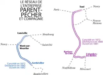 Monsieur Parent-Pécher décède le . En conséquence, la concession des lignes est résiliée pour défaut de commencement des travaux dans les temps prévus en , et reprise par le département de Meurthe-et-Moselle moyennant finances, département qui abandonne ses droits, gratuitement, à l'État, lequel confie en 1881 et 1882 l'exploitation des lignes à l'Est.