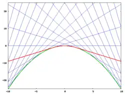 L'enveloppe de ces solutions est la parabole tracée en vert, qui constitue une solution, qualifiée de solution singulière. Il existe également des solutions « hybrides » formées en raccordant de façon un arc de parabole (verte) avec les solutions régulières (bleues). Un exemple de telle solution a été tracé en rouge.
