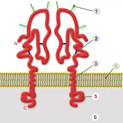 1 : Oligosaccharides – 2 : Pont disulfure – 3 : Domaine transmembranaire – 4 : Membrane lipidique – 5 : Ancrage intracellulaire – 6 : Cytoplasme – C/N : extrémités C/N de la chaîne protéique.