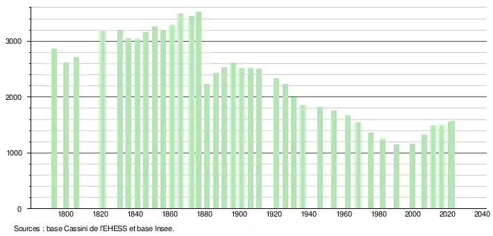 L'évolution du nombre d'habitants est connue à travers les recensements de la population effectués dans la commune depuis 1793. Pour les communes de moins de 10 000 habitants, une enquête de recensement portant sur toute la population est réalisée tous les cinq ans, les populations de référence des années intermédiaires étant quant à elles estimées par interpolation ou extrapolation[28]. Pour la commune, le premier recensement exhaustif entrant dans le cadre du nouveau dispositif a été réalisé en 2006[29].