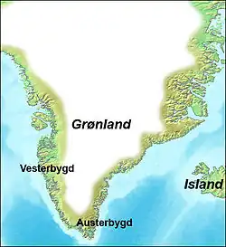 Eiríkr le Rouge est à son tour banni d'Islande pour meurtre quand après un conflit avec un voisin, Erik tue ce dernier par vengeance. Il part alors pour des terres que seuls quelques Européens avaient déjà vues avant lui, et notamment Gunnbjörn Ulfsson, le premier à les avoir découvertes entre 876 et 932. Erickr appela cette terre qui connaissait un climat plus favorable au début du deuxième millénaire, Groenland (Grønland en danois « terre verte »)[2] dans le but d'y attirer le plus de colons possible[4]. Il s'installe autour de l’actuelle ville de Qaqortoq. De retour en Islande après les trois années d'exil qu'il passe à explorer la côte orientale du Groenland, il prépare la colonisation des terres qu'il a découvertes[5].