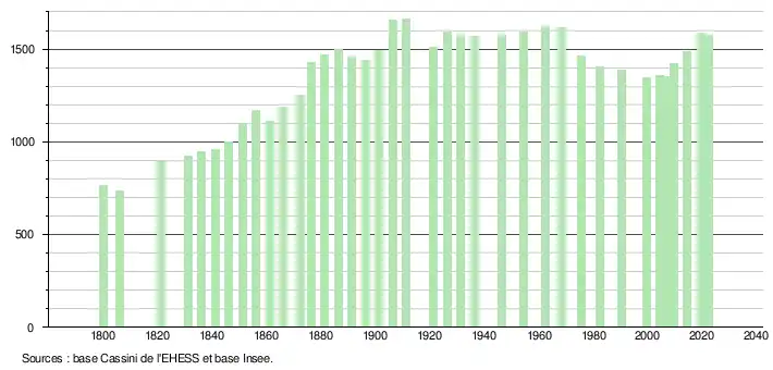 L'évolution du nombre d'habitants est connue à travers les recensements de la population effectués dans la commune depuis 1800. Pour les communes de moins de 10 000 habitants, une enquête de recensement portant sur toute la population est réalisée tous les cinq ans, les populations de référence des années intermédiaires étant quant à elles estimées par interpolation ou extrapolation[32]. Pour la commune, le premier recensement exhaustif entrant dans le cadre du nouveau dispositif a été réalisé en 2004[33].