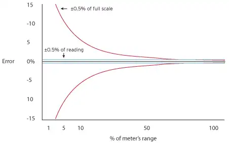 Dans le domaine de la mesure de débit, l'erreur de débitmètre est généralement rapportée par un pourcentage indiquant la non-linéarité de l'appareil. Cela peut être exprimé soit comme un pourcentage +/- basé sur la capacité totale de l'appareil, soit comme un pourcentage du débit réel indiqué[1]. En pratique, l'erreur de débitmètre est une combinaison de la répétabilité, de la précision et de l'incertitude de l'étalonnage de référence[2].