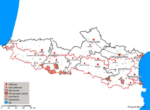 Il y aurait plus de 173 sites classés et 491 sites inscrits sur l'ensemble des 6 départements français des Pyrénées[24] :