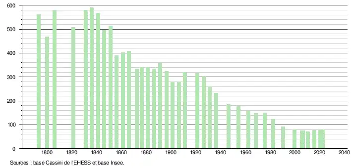 L'évolution du nombre d'habitants est connue à travers les recensements de la population effectués dans la commune depuis 1793. Pour les communes de moins de 10 000 habitants, une enquête de recensement portant sur toute la population est réalisée tous les cinq ans, les populations de référence des années intermédiaires étant quant à elles estimées par interpolation ou extrapolation[14]. Pour la commune, le premier recensement exhaustif entrant dans le cadre du nouveau dispositif a été réalisé en 2005[15].