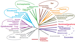 La division primaire de l'arbre est une trichotomie mettant en évidence les Unicontes, les Excavés et un troisième clade regroupant tous les autres Eucaryotes[75]. Les Rhizaria, séparés des Excavata, se retrouvent ici au sein d'un même groupe avec les Chromalveolata, comme groupe-frère des seuls Stramenopiles.
