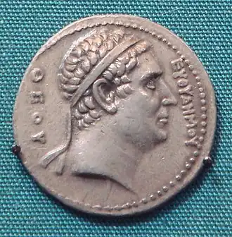 Tétradrachme d'Euthydème. L'inscription en grec ΒΑΣΙΛΕΩΣ ΕΥΘΥΔΗΜΟΥ signifie « par le roi Euthydème ».