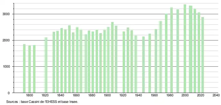 L'évolution du nombre d'habitants est connue à travers les recensements de la population effectués dans la commune depuis 1793. Pour les communes de moins de 10 000 habitants, une enquête de recensement portant sur toute la population est réalisée tous les cinq ans, les populations de référence des années intermédiaires étant quant à elles estimées par interpolation ou extrapolation[47]. Pour la commune, le premier recensement exhaustif entrant dans le cadre du nouveau dispositif a été réalisé en 2007[48].