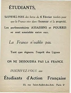 En novembre 1931, les Étudiants d'Action française participent au sabordage du Congrès de la paix au Trocadéro avec l'appui des Croix-de-Feu, des Jeunesses Patriotes, de la Ligue des Patriotes, des Camelots du Roi et des ligueurs d'Action française[20].