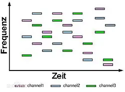 Dans les normes 802.11 initiales (publiées en 1997 et 1999), la bande de fréquence 2,4 - 2,485 GHz permettait de créer jusqu'à 79 canaux de MHz chacun[5]. La transmission se faisait ainsi, à l'aide des méthodes FHSS ou DSSS, en émettant successivement sur un canal puis sur un autre pendant une courte période de temps (maximum 400 ms) en utilisant une combinaison, connue de toutes les stations, d'une partie des canaux regroupés dans une bande de 80 MHz (22 MHz en mode DSSS), ce qui permet à un instant donné de transmettre un signal facilement reconnaissable sur une fréquence donnée. Les versions plus récentes des normes 802.11 (g, n, ac et ax) utilisent d'autres méthodes de codage sans « saut de fréquence », mais permettant des débits plus élevés : l'OFDM et l'OFDMA.