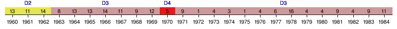 | 1969 | 12e | 35 | 38 | 11 | 13 | 14 | 25 | 27 | -2 | — | |