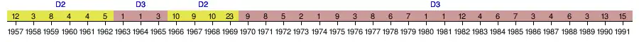 | 1959 | 2e Zone 7 | 8e | 25 | 26 | 11 | 3 | 12 | 43 | 39 | +4 | — |