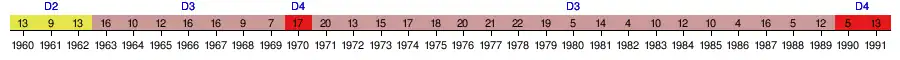 | 1971 | 3e Zone 4 | 20e | 25 | 38 | 7 | 11 | 20 | 24 | 40 | -161 | |