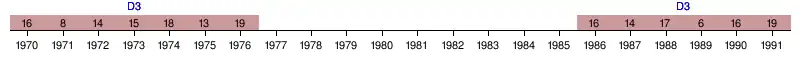| 1990 | 3e Ouest | 16e | 37 | 42 | 12 | 13 | 17 | 34 | 45 | -11 | |