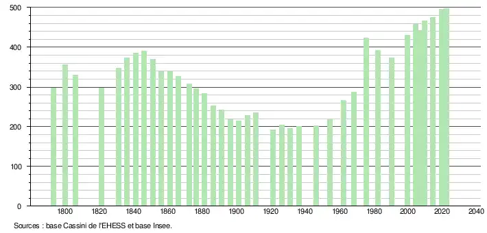- ↑ Population municipale de référence en vigueur au 1er janvier 2025, millésimée 2022, définie dans les limites territoriales en vigueur au 1er janvier 2024, date de référence statistique : 1er janvier 2022.