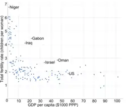 L'augmentation des revenus et le développement humain sont généralement associés à une baisse des taux de fécondité[36]. Les théories économiques sur la baisse de la fécondité postulent que les personnes qui gagnent plus ont un coût de renoncement plus élevé si elles se concentrent sur l'accouchement et l'éducation des enfants plutôt que sur la poursuite de leur carrière[1], que les femmes qui peuvent subvenir à leurs besoins économiques sont moins incitées à se marier[1], et que les parents qui ont des revenus plus élevés privilégient la qualité à la quantité et consacrent donc leurs ressources à moins d'enfants[1].