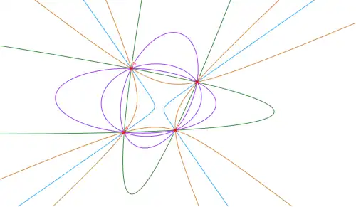 Une conique (non dégénérée) est complètement déterminée par cinq points en position générale (aucun triplet de points alignés) dans un plan et le système de coniques qui passent par un quadruplet de quatre points (également coplanaires et sans triplet de points alignés) est appelé un faisceau de coniques[11]. Les quatre points communs sont appelés points de base du faisceau. Par chaque point autre qu'un point de base, il passe une unique conique du faisceau. On peut voir cette construction comme une généralisation du faisceau de cercles.
