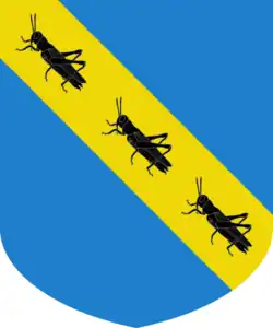 Les armes des Grioni se blasonnent ainsi d'une bande d'or chargée de trois grils de sable en champ d'azur.