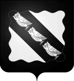 « D'argent à la bande de sable chargée de trois hiboux du champ, à la bordure ondée du second émail. »
