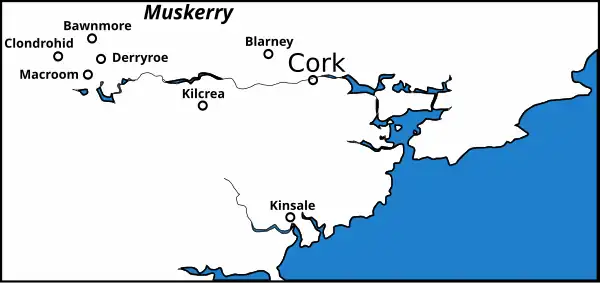Les successeurs de Raghnall O'Riordan sont restés attachés aux descendants de ce Dermot MacCarthy, auprès desquels ils se sont établis dans le comté de Cork, au nord de Macroom (province de Muskerry). Les O'Riordan, désormais chefs ou comtes du Clan Riordan (gaélique : taisech Muintir Riordain, anglais : chief of Munter Riordan[8]) étaient les premiers feudataires des Lords de Muskerry[9].