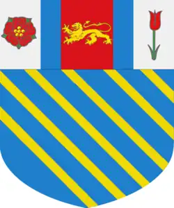 - d'azur avec cinq cotices d'or sous un chef tiercé en pal, le premier d'argent à une rose de gueules, le second de gueules à un lion d'or, le troisième d'argent à une tulipe de gueules.