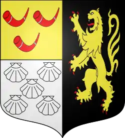 de sable au lion d’argent; au franc quartier d'or à trois huchets de gueules, virolés d'argent (Hornes)[4],[5].