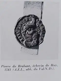 1° Pierre (le vieux), échevin de Huy et de Wanze (1541), membre du métier des vignerons, mayeur héréditaire de Waleffe-Saint-Pierre (1560), tenant de la Cour jurée de Notre-Dame des Carmes à Huy; l’ancien château ferme et la seigneurie de Waleffe-Saint-Pierre étaient tenus par Henry d’Acosse, écuyer, époux de Catherine de Huy, grand-père de Marie d'Acosse.; Pierre de Brabant fut chargé avec le fourrier Antoine Mureau par le Prince-évêque Georges d’Autriche le 6 mai 1552 d’empêcher les gens de guerre de commettre des dégâts dans le pays et les chanoines tréfonciers de la Cathédrale le prièrent en 1560 de remettre la cour en activité[13], + 23 mai 1573, x Marie d'Acosse laquelle testa le 23 janvier 1582 et laissa divers biens à ses neveux, Pierre (le jeune), ainsi qu’à Godefroid et Charles de Brabant, enfants de Godefroid et Jeanne Menjoye, + 9 mars 1584, fille de Gilles et de Marie Bozea de Thiribu. Sans postérité. Pierre reçut une sépulture en l'église des Dames Blanches à Huy en armes, portant les quartiers Brabant - Sywalart - Acosse - Bozeal de Thiribu. Son épouse Marie fut inhumée dans une sépulture collective à Waleffe-Saint-Pierre où reposaient Henry d'Acosse jadis échevin de la cour de Wanze (+ 21 juillet 1507), Sibylle Sywalart, femme de de Jean V, (+ 21 septembre 1538), Pierre de Brabant (le jeune) et son épouse Jehenne de Remikette.