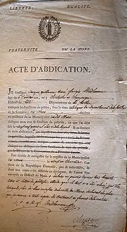 Il est élu évêque constitutionnel de la Sarthe, son ordination épiscopale se déroulera à Paris le . Il démissionne en 1793 lors de l'instauration du Culte de la Raison et de l'Être suprême et se démet officiellement le .