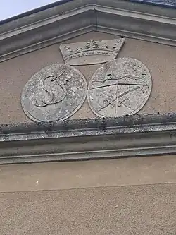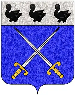 | Blasonnement | D'azur à deux épées d'argent garnies d'or passées en sautoir, au chef d'argent chargé de trois merlettes de sable. |