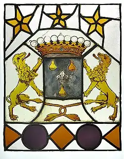 | Blasonnement | D'azur à trois poires feuillées d'or, les queues en haut, accompagnées en abîme d'une fleur de lys du même. |