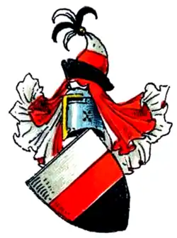 Le blason est divisé par l'argent, le rouge et le noir. Sur le casque avec lambrequins rouge-argenté à droite et noir-argenté à gauche, un écran (de) entre un vol ouvert, également divisé.