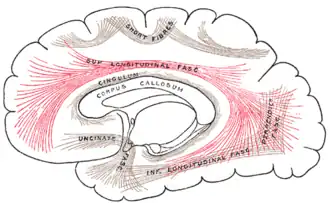 Le Fascicule longitudinal supérieur (SLF) est un tractus associatif du cerveau composé de trois branches principales[1],[2]. Il est présent au sein des deux hémisphères, de manière latérale au centrum semiovale et relie les lobes frontal, occipital, pariétal et temporal[2]. Ce faisceau de trajets (fascicule) passe du lobe frontal à travers l'opercule jusqu'à l'extrémité postérieure du sillon latéral où il rayonne vers les neurones du lobe occipital et y fait synapse, ou tourne vers le bas et l'avant autour du putamen, puis rayonne vers les neurones des parties antérieures du lobe temporal et y fait synapse.