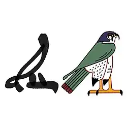 Il représente un faucon pèlerin (Falco peregrinus) ou un faucon lanier (Falco biarmicus). Il est translittéré Ḥr.