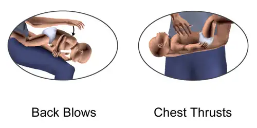 Il faut combiner[7] deux techniques manuelles modifiées pour des bébés: des "coups dans le dos" et des "pressions thoraciques anti-étouffement". Pour de meilleurs résultats, on peut les combiner à tour de rôle: chaque technique est répétée environ 5 fois, puis un changement est effectué en passant à l'autre technique, et les tours sont répétés en continu de cette façon. (Voir les illustrations ci-dessous).