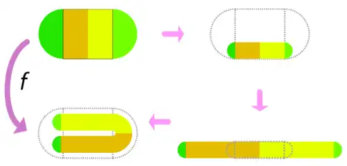 On définit f par composition, en appliquant d'abord une affinité orthogonale de rapport selon l'axe vertical aux points du carré, tandis que les demi-disques subissent une homothétie pour garder leur forme de disque. Il est important que le facteur a soit strictement inférieur à 1/2 pour assurer une marge entre les deux branches du fer à cheval dans la dernière étape. On applique ensuite au rectangle une affinité orthogonale dans l'autre direction, et de rapport , sans changer les demi-disques. Au terme de ces deux étapes l'aire du carré a été conservée, pas celle des demi-disques.
