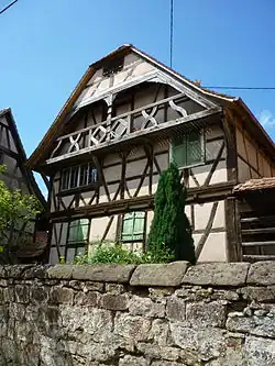 Les bâtiments de cette ancienne exploitation agricole s'organisent autour d'une grande cour. Le logement sur deux niveaux, perpendiculaire à la rue, fut construit en 1599 d'après un millésime gravé sur un poteau cornier (visible depuis la rue). Cette habitation a par conséquent survécu aux ravages de la guerre de Trente Ans (1618-1648) qui a mis à mal bien des villages d'Alsace. Le logement est en retrait par rapport à la rue. Il est séparé de cette dernière par un jardinet et par un mur. L'habitation est entièrement en pan de bois avec un soubassement en maçonnerie crépie. Le premier étage est en léger encorbellement sur trois côtés. Le colombage se caractérise par des poteaux avec des goussets et des liens pleins en chevrons. Vers la rue, le pignon en encorbellement dispose d'une loggia sous une toiture en demi-croupe. Le garde-corps restauré est formé de losanges et de chaises curules. La chambre d'angle de l'étage est éclairée par deux fenêtres ornées de chambranles saillants et sculptés (motifs géométriques en relief).