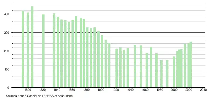 L'évolution du nombre d'habitants est connue à travers les recensements de la population effectués dans la commune depuis 1793. Pour les communes de moins de 10 000 habitants, une enquête de recensement portant sur toute la population est réalisée tous les cinq ans, les populations de référence des années intermédiaires étant quant à elles estimées par interpolation ou extrapolation[31]. Pour la commune, le premier recensement exhaustif entrant dans le cadre du nouveau dispositif a été réalisé en 2004[32].