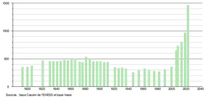 L'évolution du nombre d'habitants est connue à travers les recensements de la population effectués dans la commune depuis 1793. Pour les communes de moins de 10 000 habitants, une enquête de recensement portant sur toute la population est réalisée tous les cinq ans, les populations de référence des années intermédiaires étant quant à elles estimées par interpolation ou extrapolation[17]. Pour la commune, le premier recensement exhaustif entrant dans le cadre du nouveau dispositif a été réalisé en 2008[18].