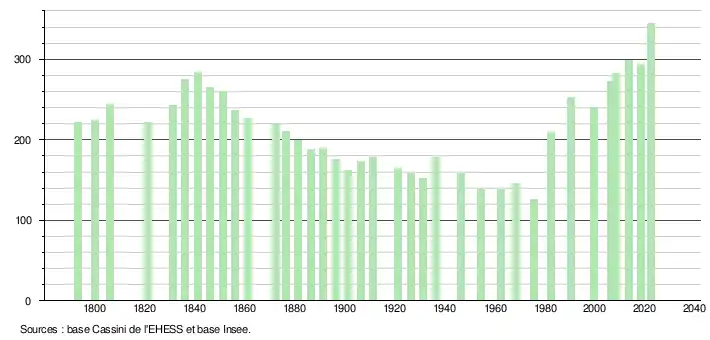 L'évolution du nombre d'habitants est connue à travers les recensements de la population effectués dans la commune depuis 1793. Pour les communes de moins de 10 000 habitants, une enquête de recensement portant sur toute la population est réalisée tous les cinq ans, les populations de référence des années intermédiaires étant quant à elles estimées par interpolation ou extrapolation[18]. Pour la commune, le premier recensement exhaustif entrant dans le cadre du nouveau dispositif a été réalisé en 2008[19].