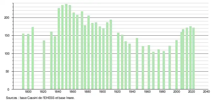 L'évolution du nombre d'habitants est connue à travers les recensements de la population effectués dans la commune depuis 1793. Pour les communes de moins de 10 000 habitants, une enquête de recensement portant sur toute la population est réalisée tous les cinq ans, les populations de référence des années intermédiaires étant quant à elles estimées par interpolation ou extrapolation[21]. Pour la commune, le premier recensement exhaustif entrant dans le cadre du nouveau dispositif a été réalisé en 2008[22].