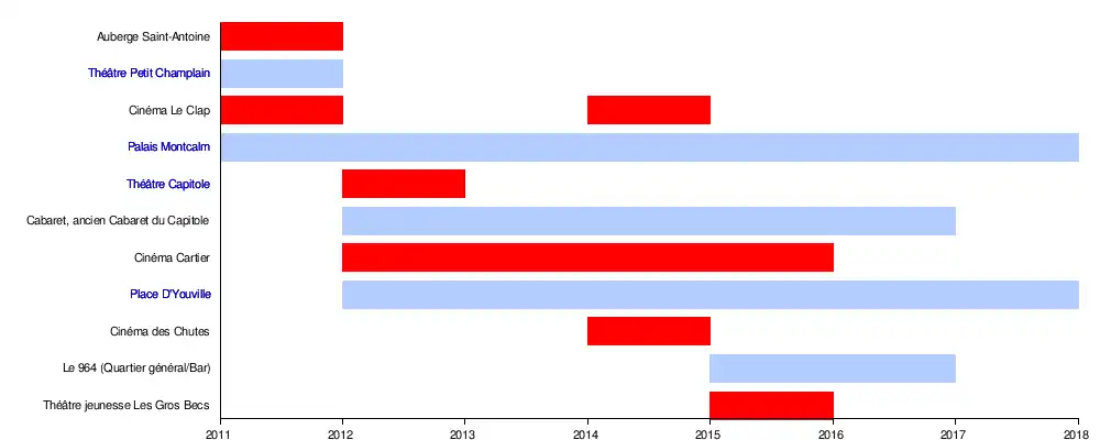 Réalisant ses activités principalement dans le centre-ville de Québec, le FCVQ a été présent dans les lieux suivants :