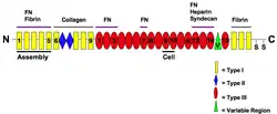 Les fibronectines ont une affinité pour le collagène (natif ou dénaturé), le fibrinogène et la fibrine, les glycosaminoglycannes, les protéoglycannes et la surface de divers types de cellules eucaryotes - - - - -. Elle favorise la formation d'un thrombus en cas de plaie vasculaire, se déposant sur cette dernière et se fixant à la fibrine, tout en favorisant l'agrégation plaquettaire[9].